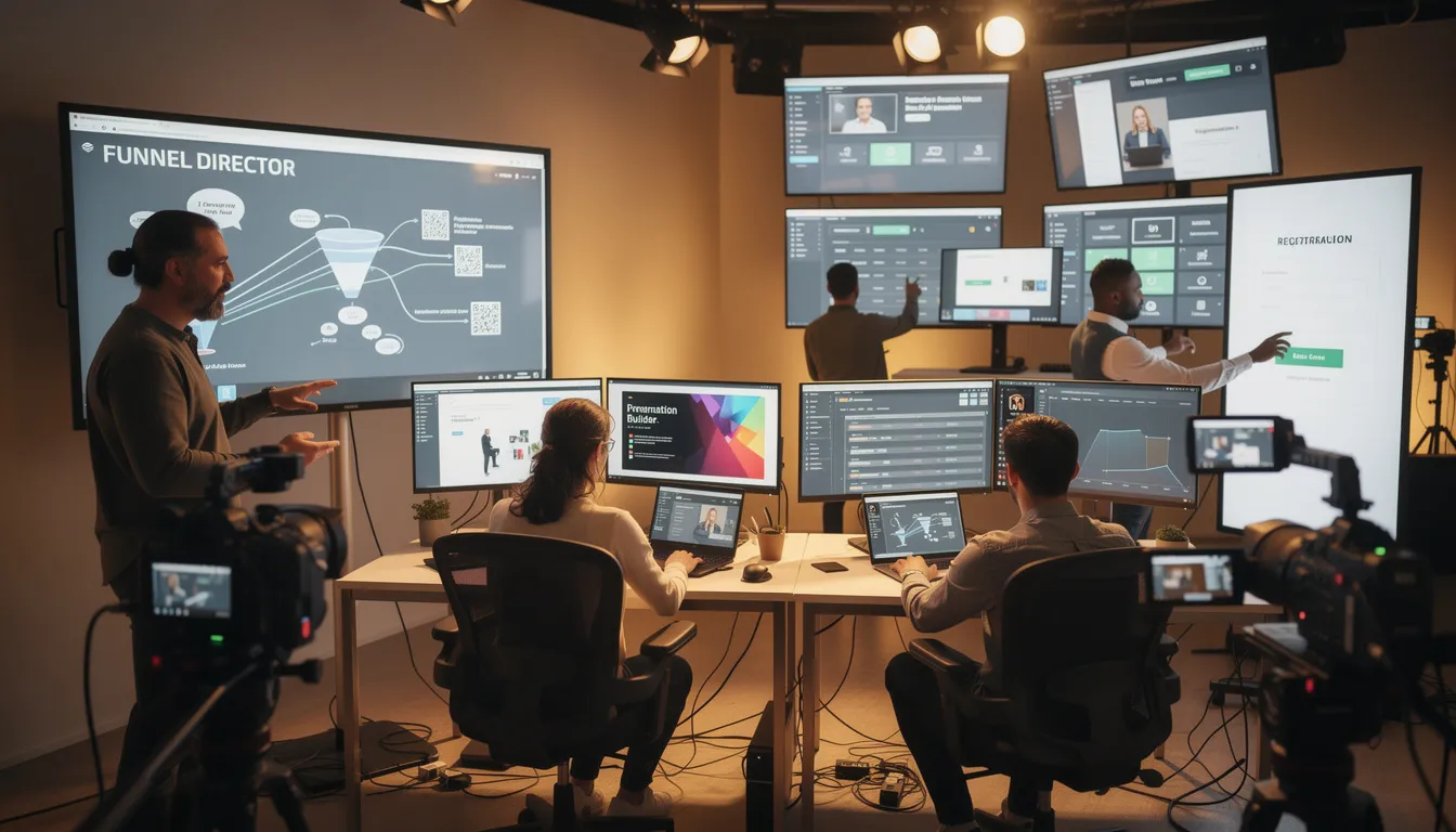 A webinar funnel team that builds presentation content, email warmup sequences, registration pages, and replay follow-up. One good webinar equals a recurring revenue engine.